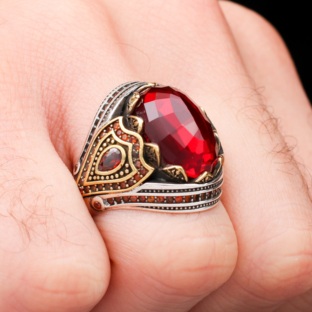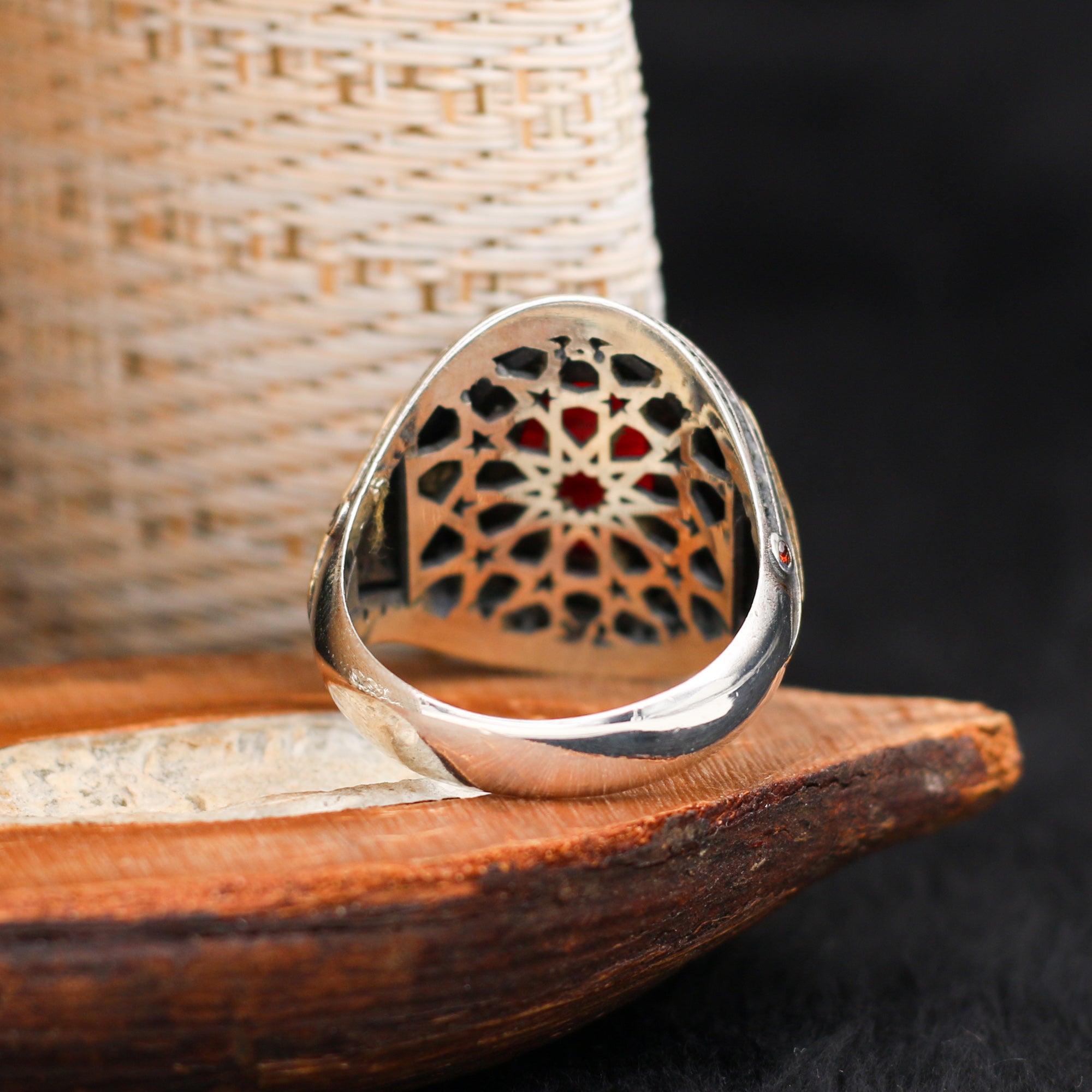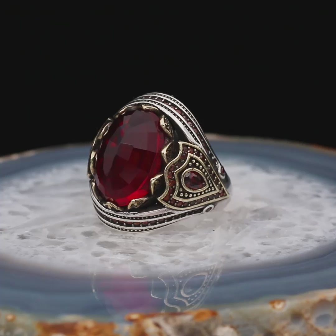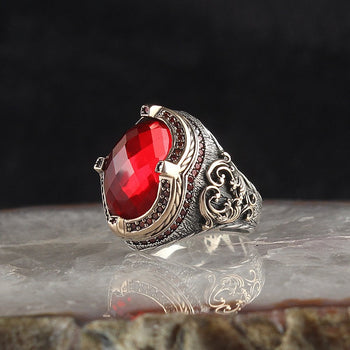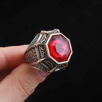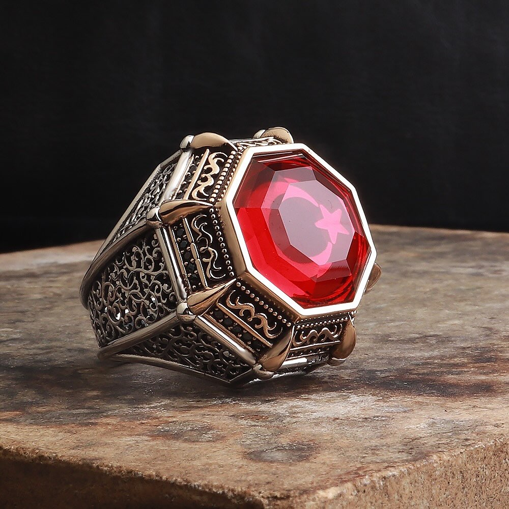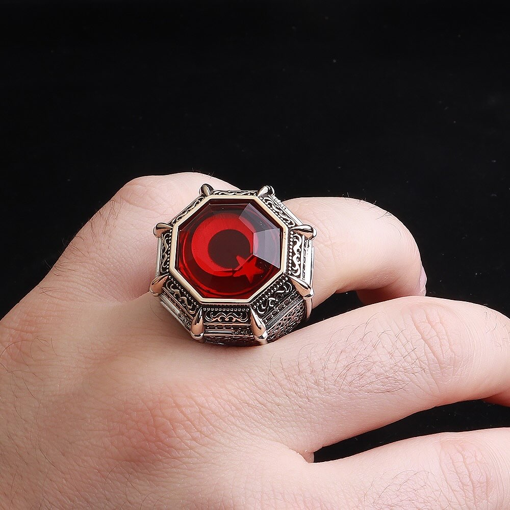 Kırmızı Zirkon Taşlı Özel Seri Ay Yıldızlı Gümüş Yüzük