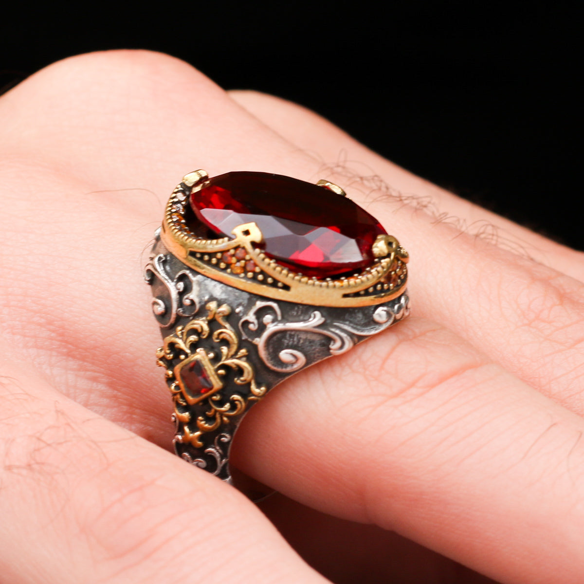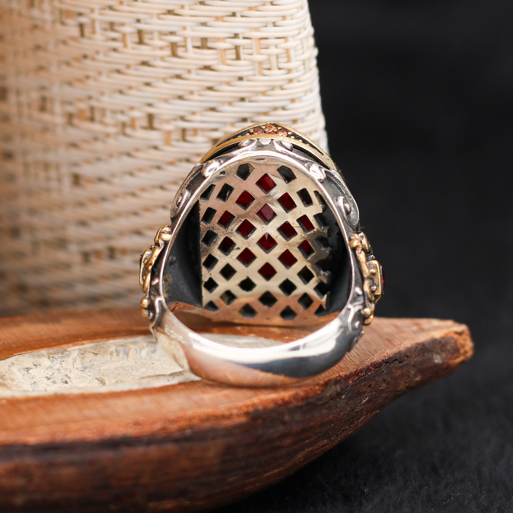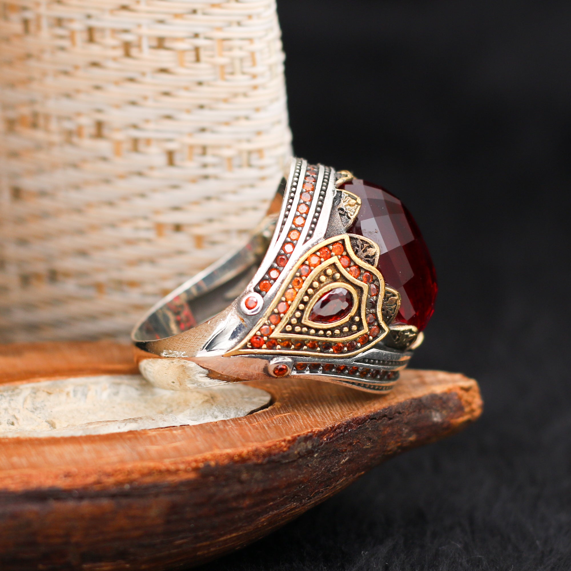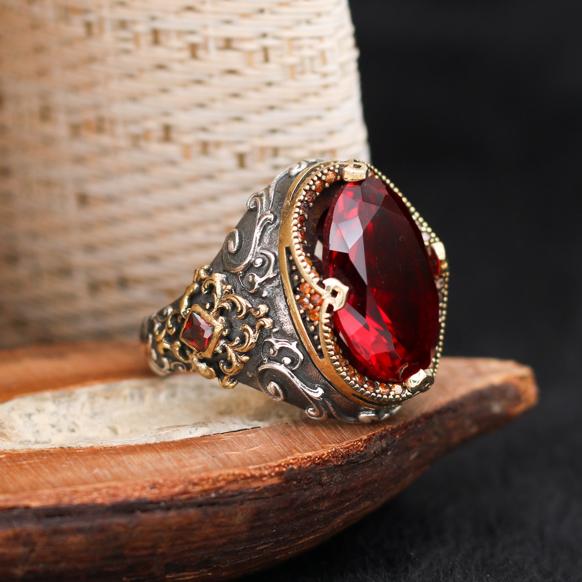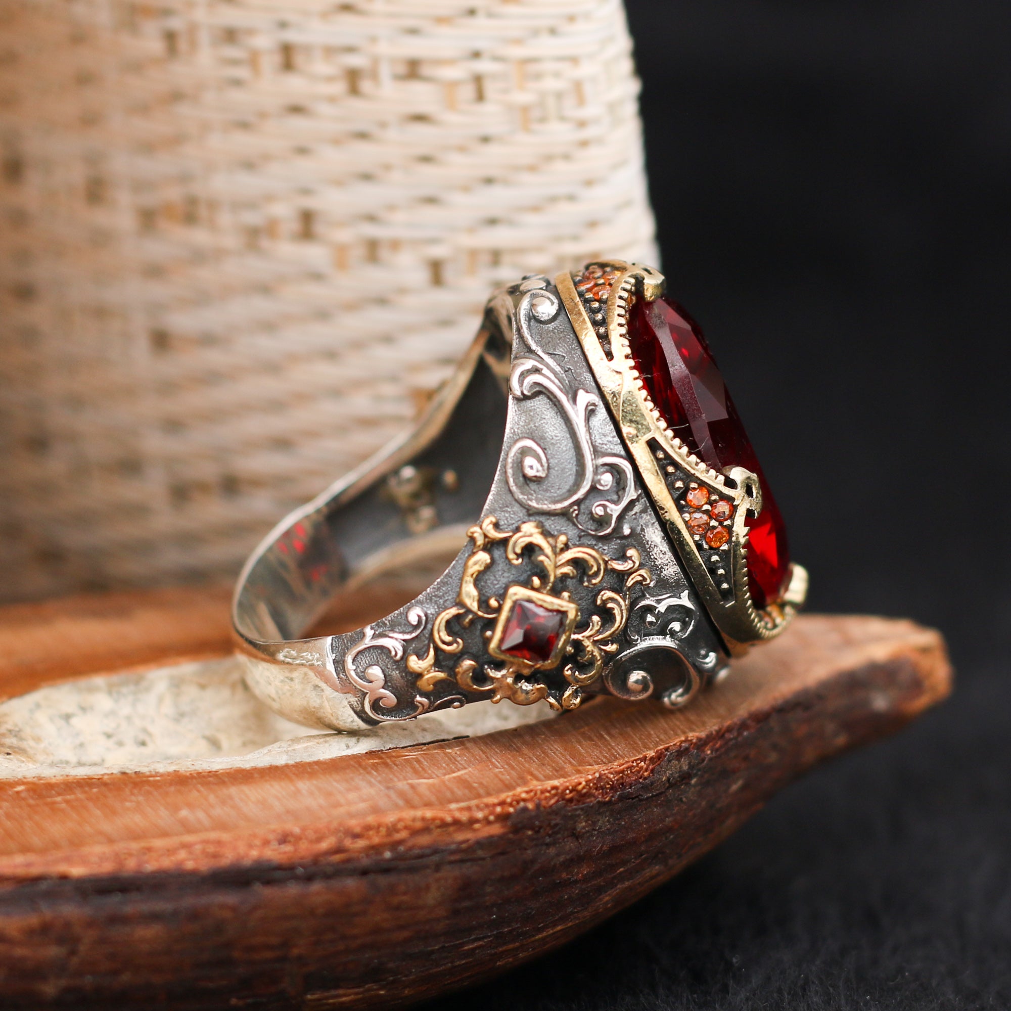 Telkari Serisi Kırmızı Taşlı Gümüş Yüzük