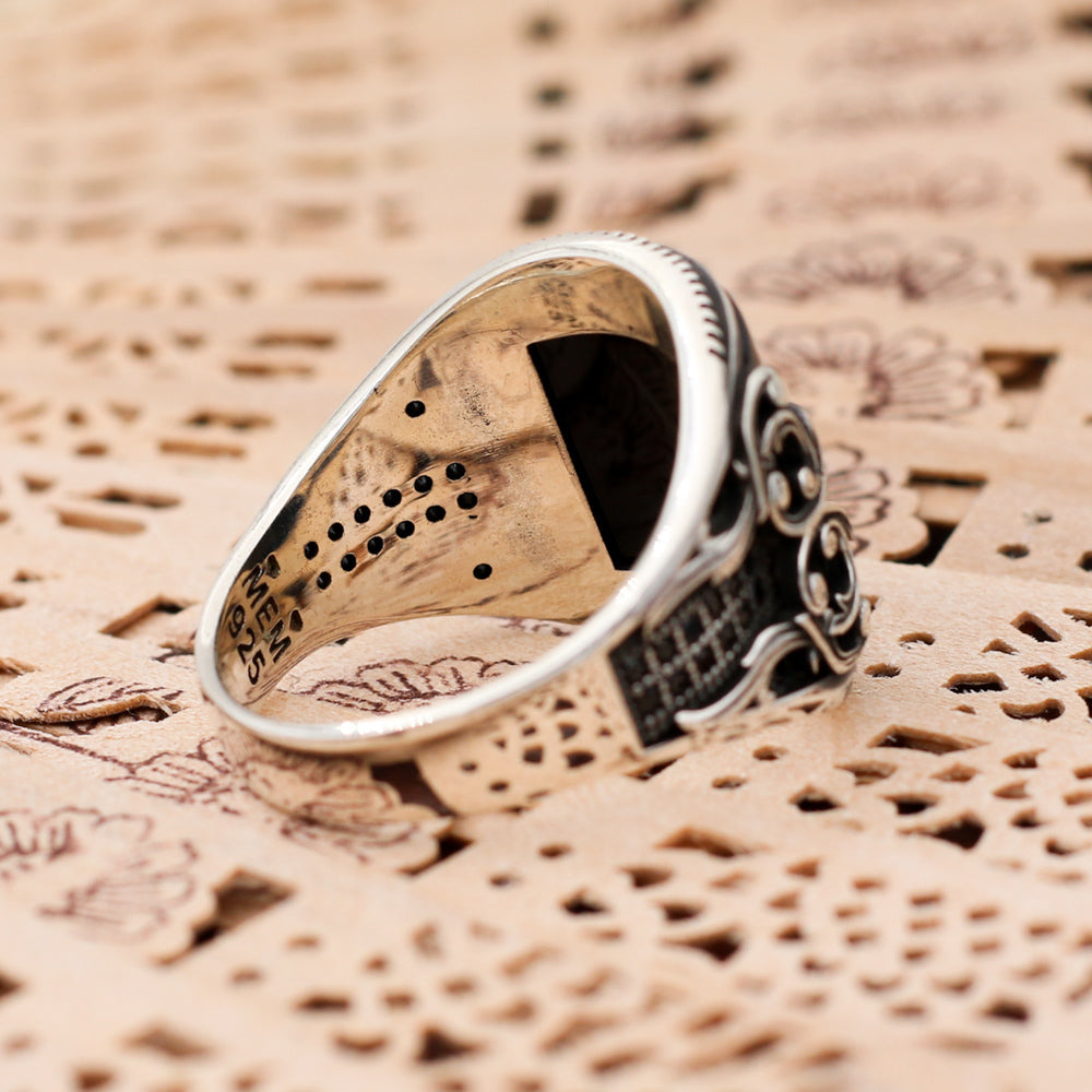 Mat Oniks Taşlı Kalem İşlemeli 925 Ayar Gümüş Yüzük