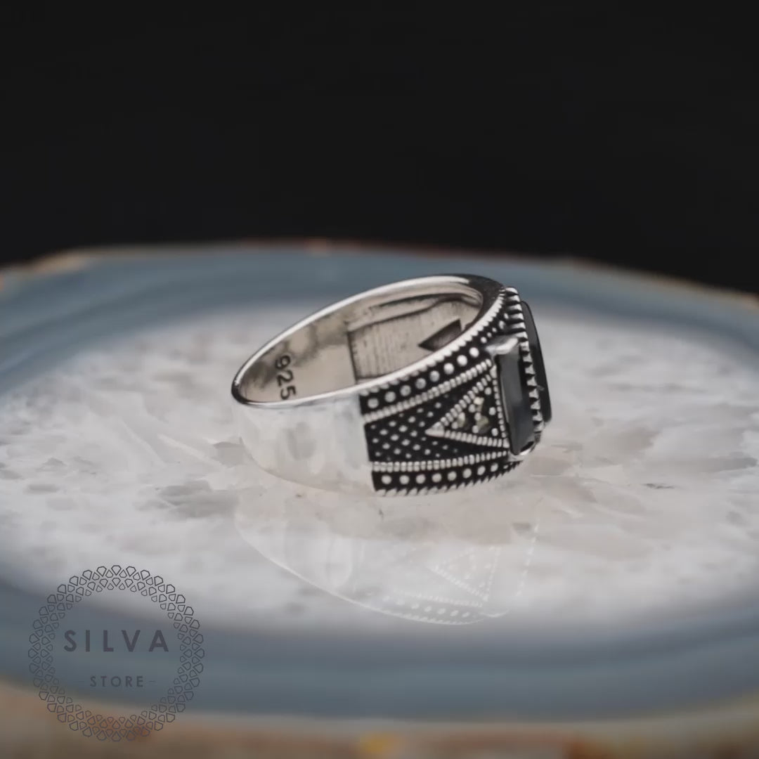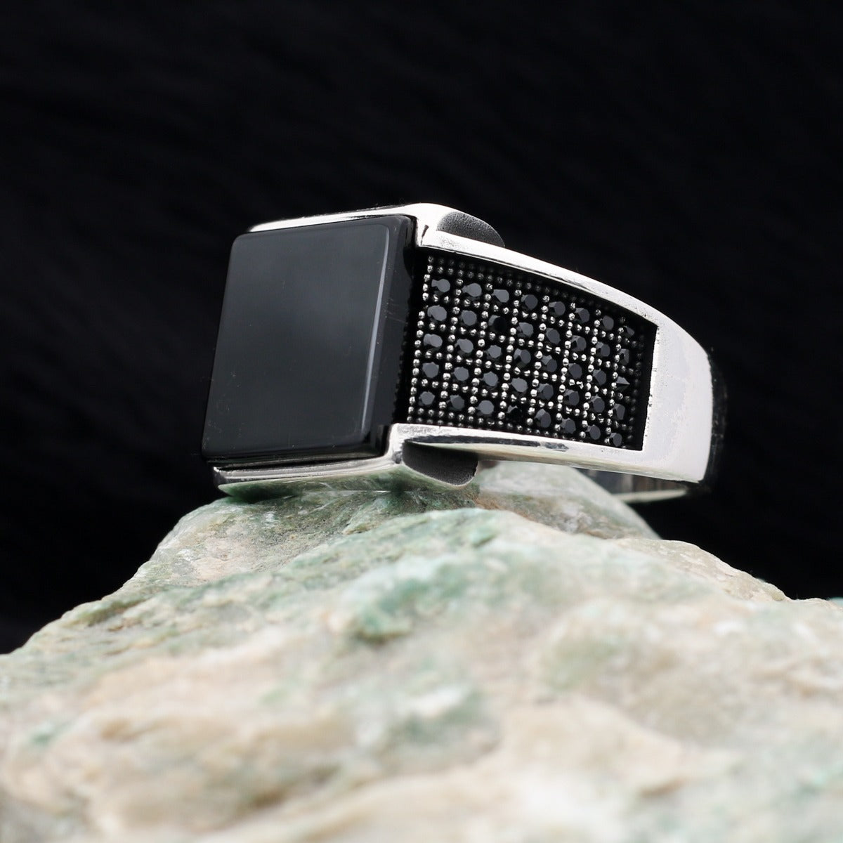 Siyah Kare Oniks Taşlı Gümüş Yüzük