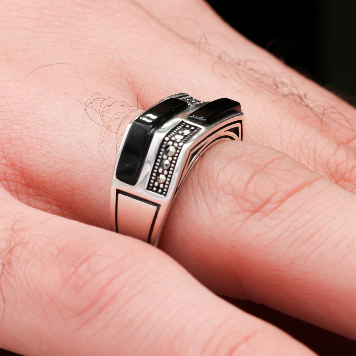 Markazit Ve Siyah Oniks Taşlı Gümüş Yüzük