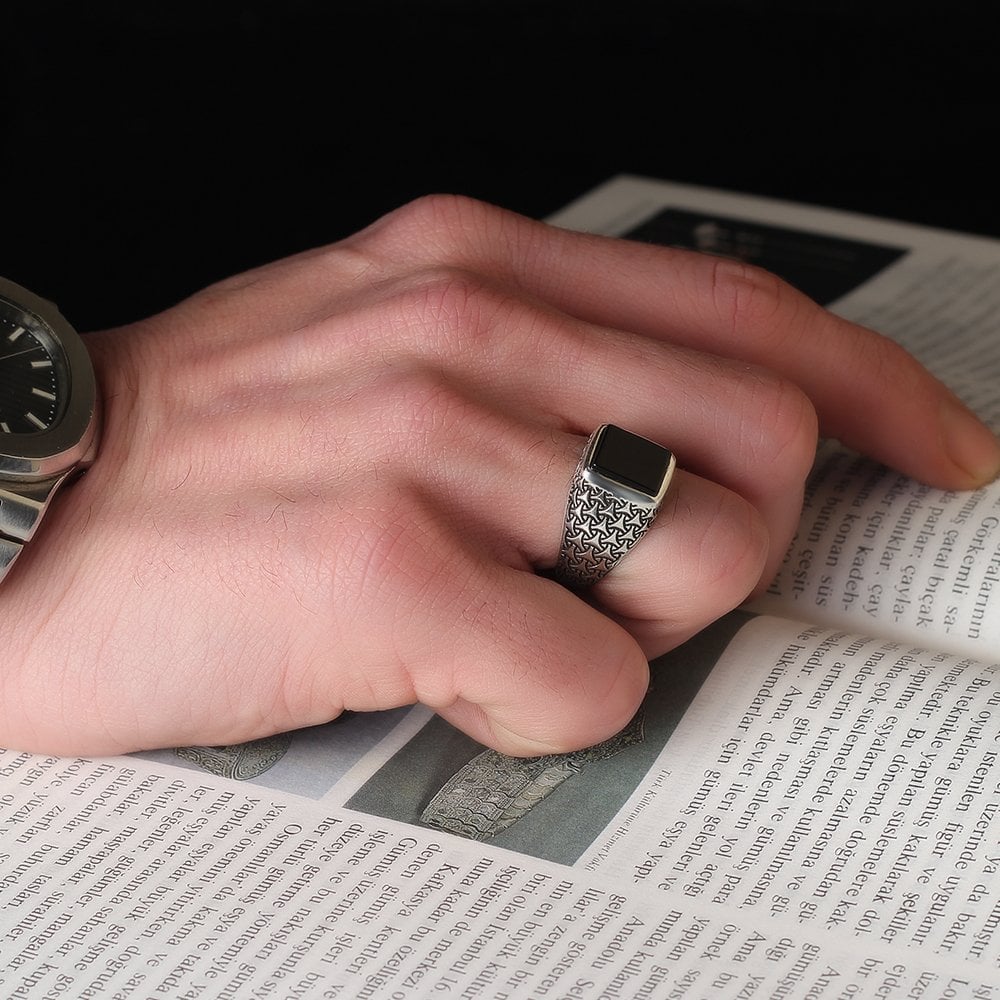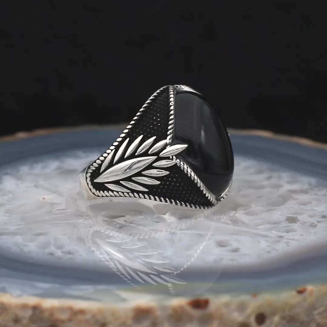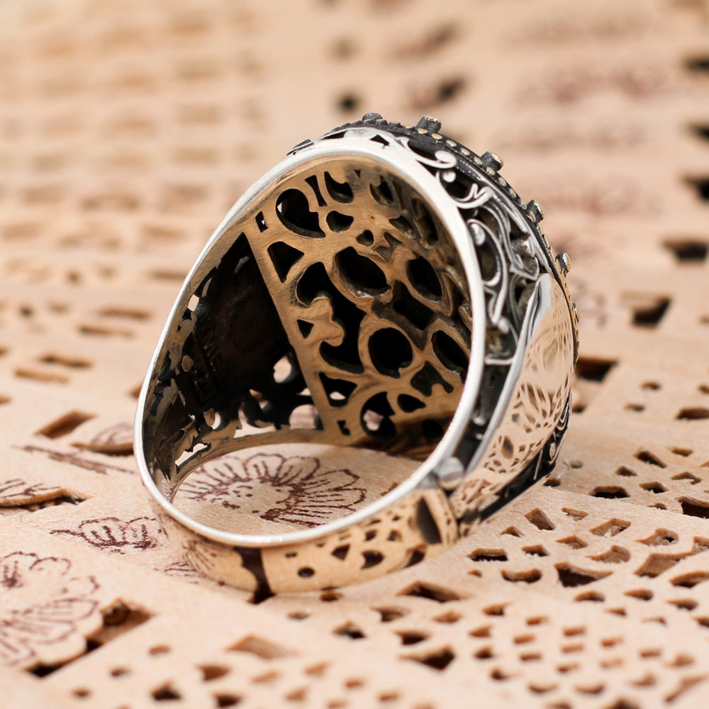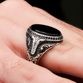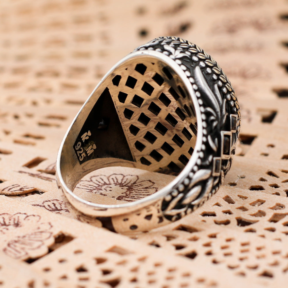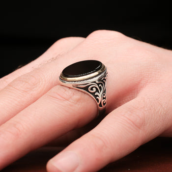 Siyah Oniks Taşlı İşlemeli Gümüş Yüzük