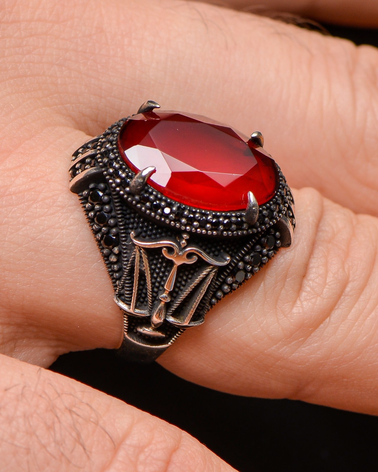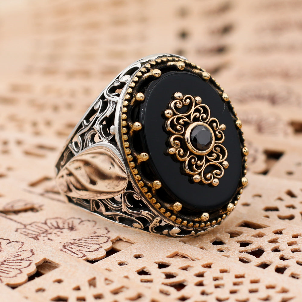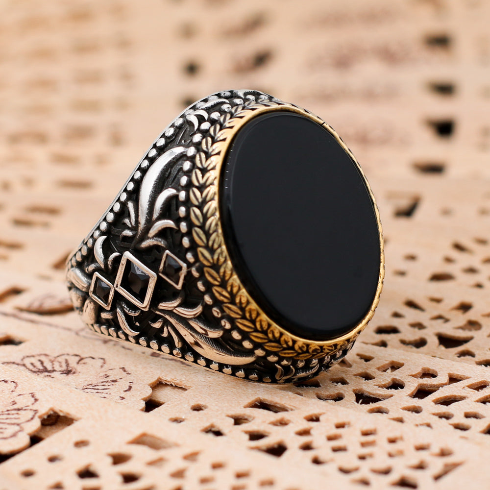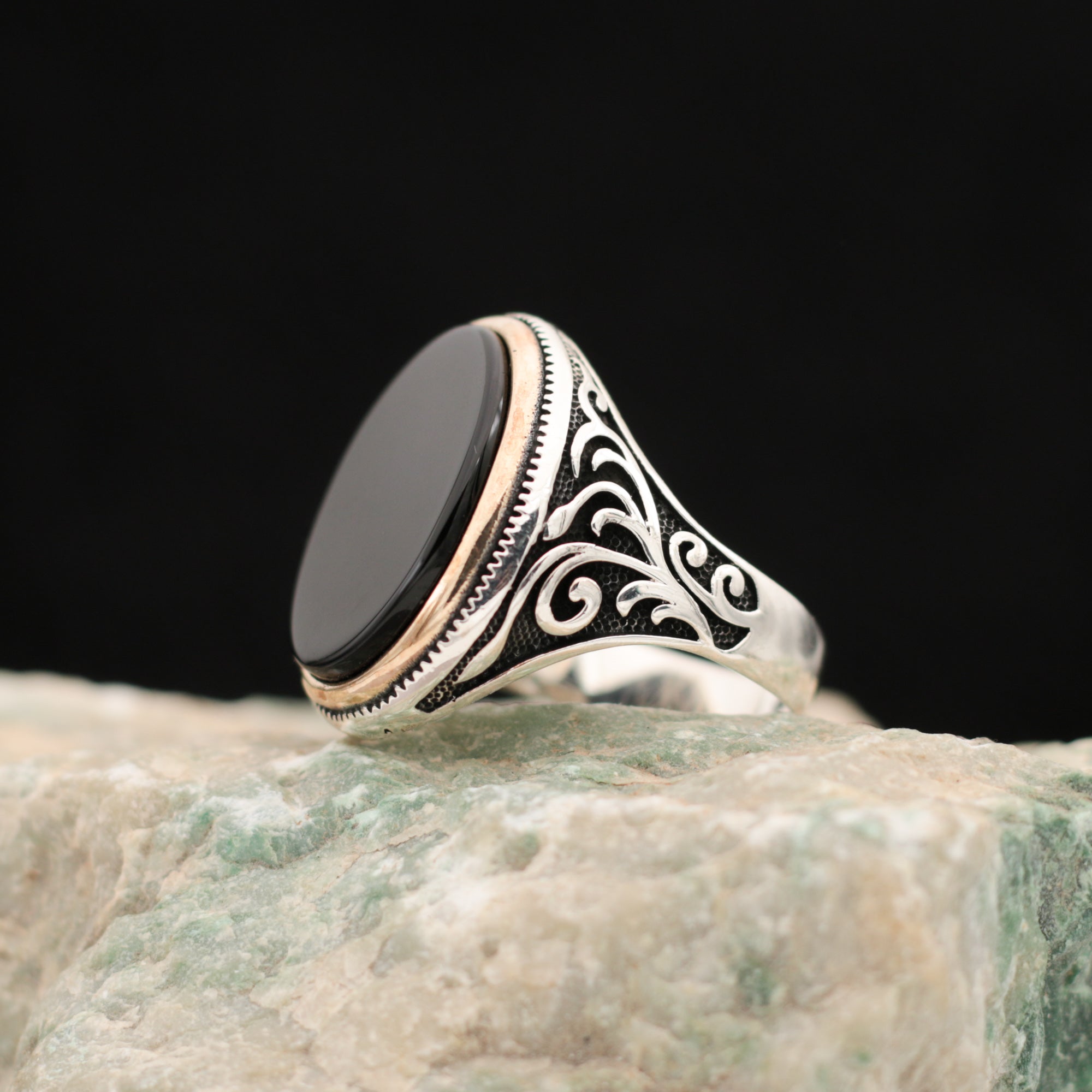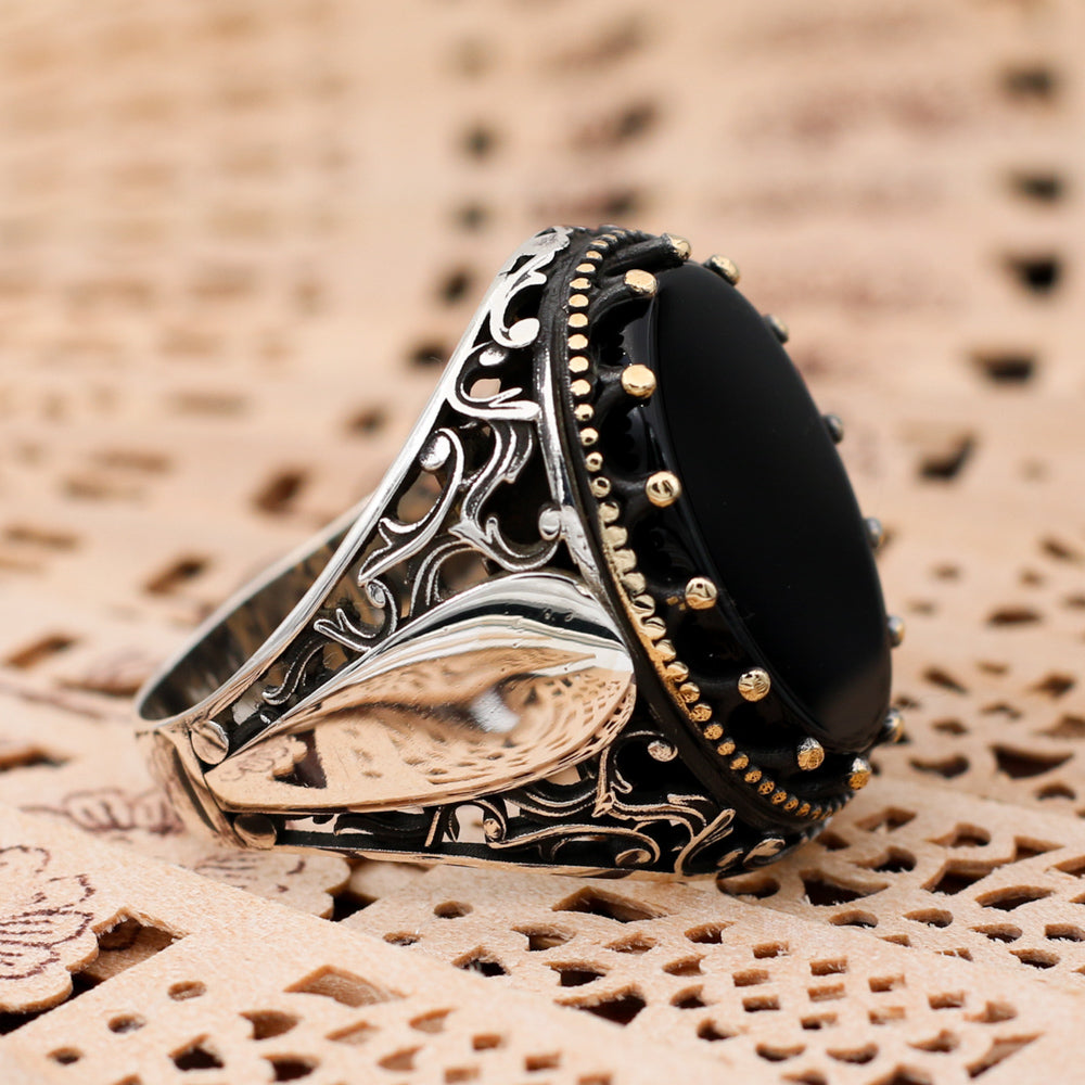Siyah Oniks Taşlı İşlemeli Yüzük