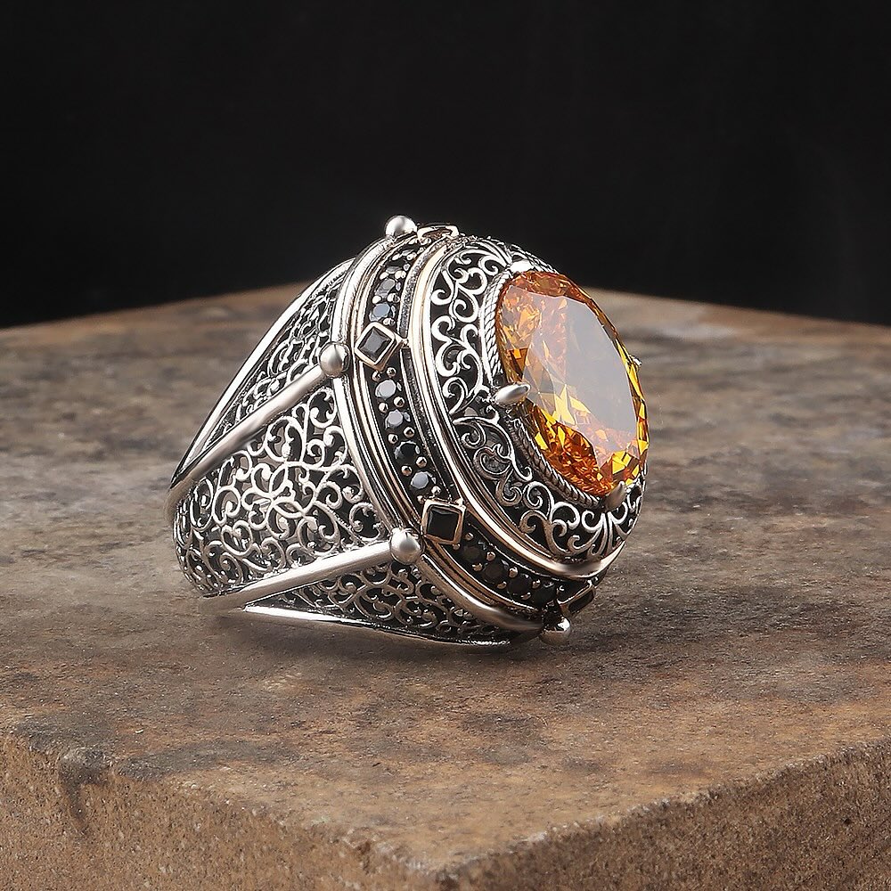 Özel Telkari Serisi Sitrin Taşlı Gümüş Yüzük