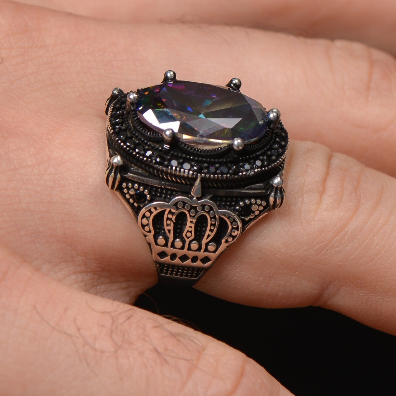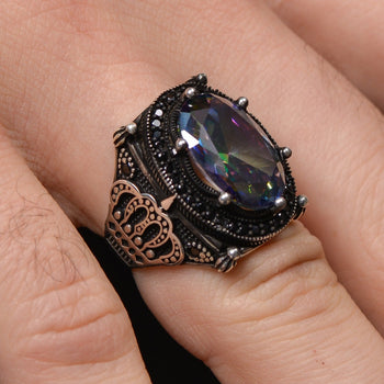 Mistik Topaz Taşlı Kral Taç Motifli Yüzük