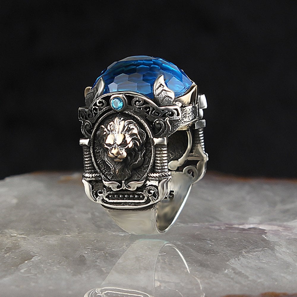 Aslan Figürlü Mavi Zirkon Taşlı Gümüş Yüzük